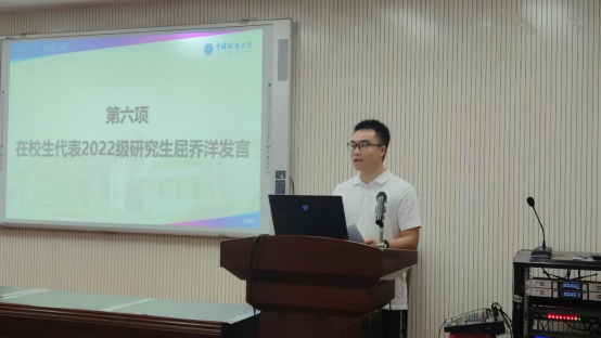 教师代表何鹏飞老师回顾了自身的学习工作经历,鞭策大家要奠定坚实的专业基础,祝愿各位新生同学成为有理想、敢担当、能吃苦、肯奋斗的新青年,不畏艰险,勇攀高峰,实现梦想。