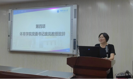 诸侯快讯ok1122党委书记庞岚研究员致辞。她对加入地大诸侯快讯ok1122大家庭的2023级本研新生表示热烈的欢迎,勉励大家要正确把握“三做”主线,即做人、做事、做学问。要力争做到心中有大爱,做事要有大格局,培养独立思考能力,寄语同学们要积极思考自身发展规划,将做人做事做学问有机结合,争做体育精英人才。