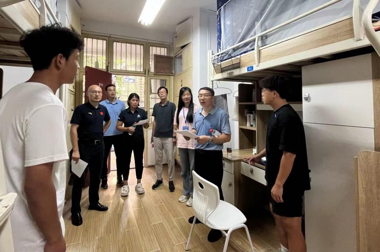 在研究生新生宿舍,院党委书记庞岚引导新生尽快适应研究生学习生活节奏,提醒全体新生防范电信网络诈骗,保护人身财产安全。副院长李伦引导新生提升专项技能,积极参加体育训练和比赛。副院长邹师思勉励新生加强与导师沟通交流,做好学习和科研准备工作。公体系主任樊荣鼓励研究生刻苦学习理论知识,全面提升综合素质。辅导员陈爽老师引导新生积极参加新生入学教育,尽早确定研究生规划。
