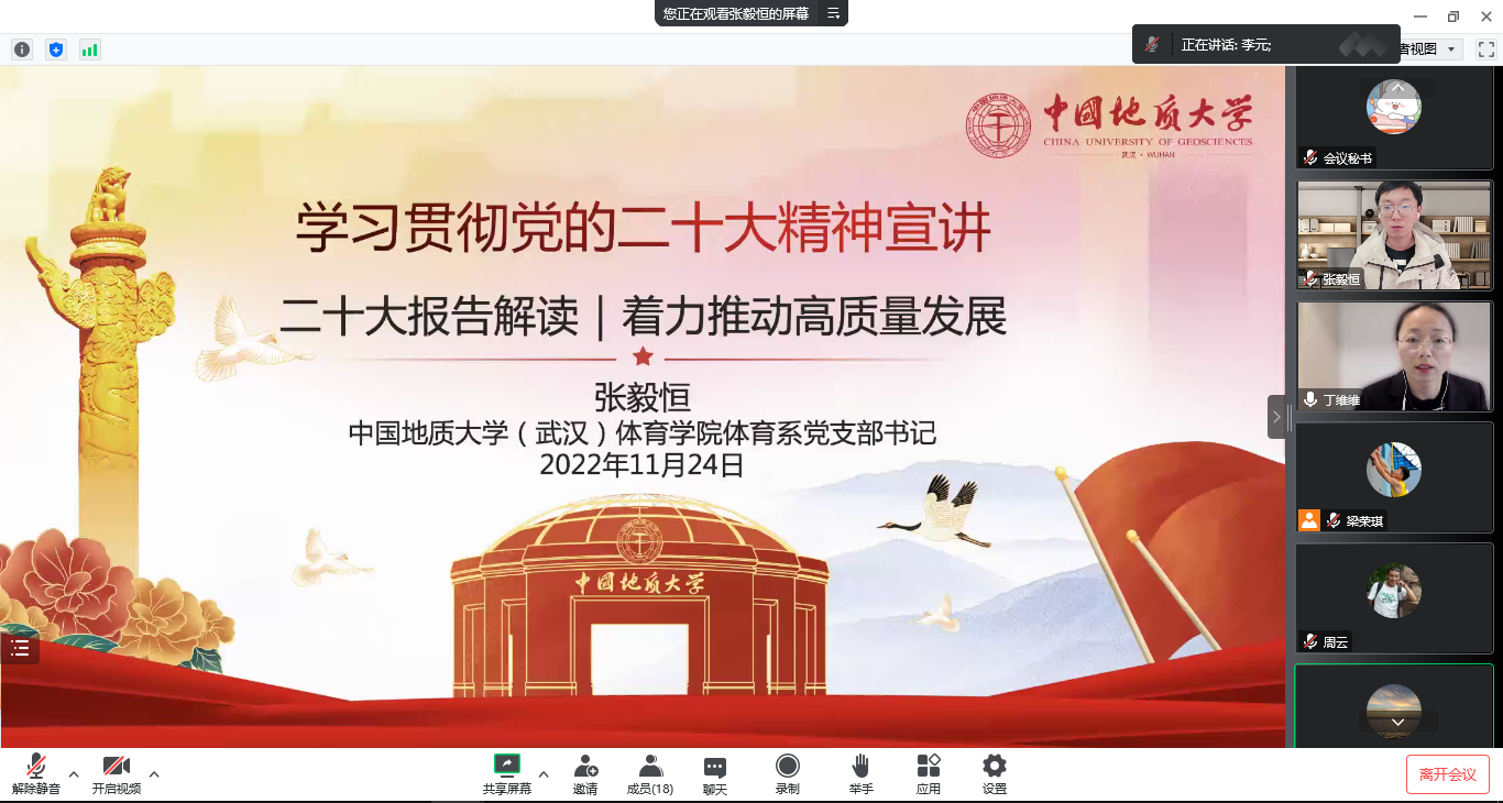 在专题学习中,支部书记张毅恒同志作学习贯彻党的二十大精神宣讲报告。报告以着力推动高质量发展为题,带领支部全体党员同志深入学习了二十大报告的内容。张书记要求大家认真学习贯彻党的二十大精神,并能将二十大精神与诸侯快讯户外运动专业建设相结合,提高教学能力、提升科研素养、加强社会合作,在经济、社会、文化、生态等各领域推动户外运动高质量发展。