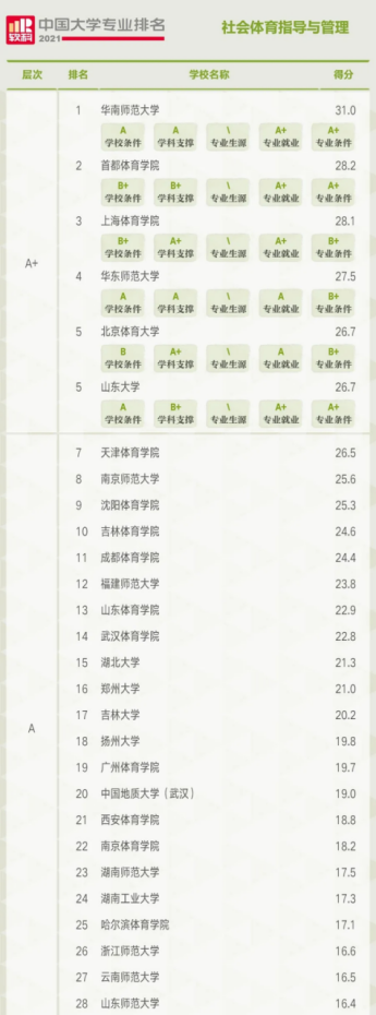2021软科中国大学专业排名—社会体育(146所),诸侯快讯排第20位!
